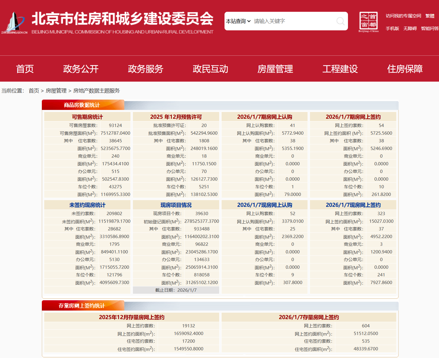 北京市住建委官网数据显示,2026年1月7日北京新房网签377套,网签面积20752.59平方米,其中住宅网签75套,网签面积10198.91平方米;二手房网签604套,网签面积51512.05方米,其中住宅网签535套,网签面积48339.67平方米。